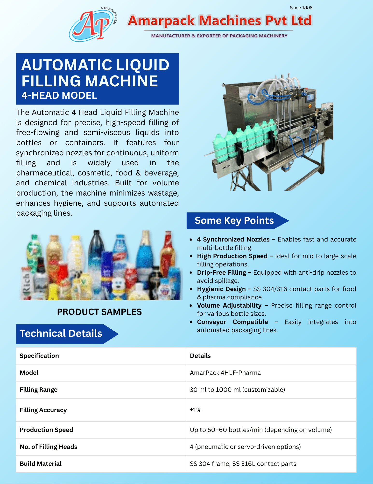 Manufactured by AmarPack Machines Pvt Ltd, a leading 4 Head Liquid Filling Machine Manufacturer in India, this model is highly demanded by pharma industries in Baddi, Ahmedabad, Hyderabad, Mumbai, and other key pharma hubs.